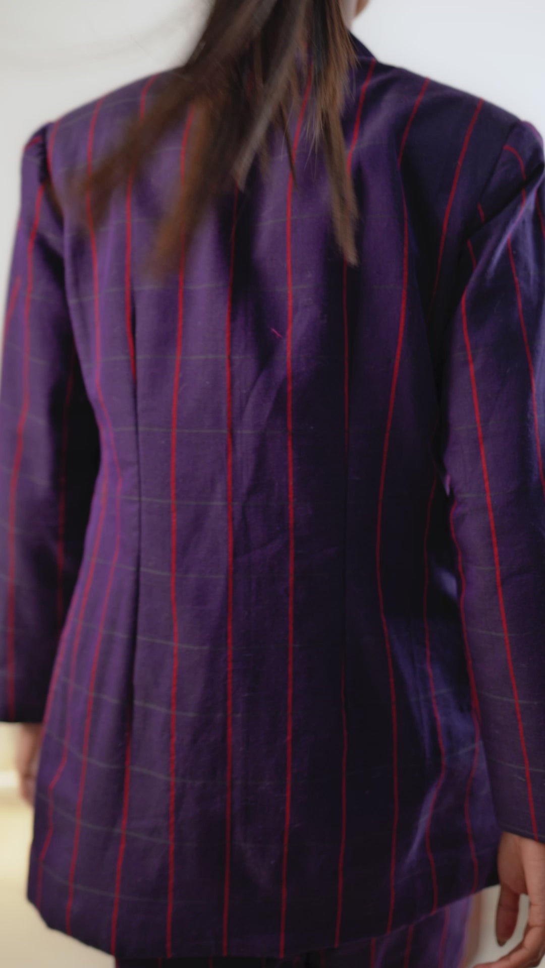 Jacket: The longline jacket is a statement piece, offering a sophisticated fit with sharp shoulder pads and a soft satin lining that ensures a comfortable and structured drape. The subtle stripes in the fabric add a touch of modern elegance, while the deep, rich color exudes timeless charm. The jacket's tailored fit accentuates the waist, creating a flattering silhouette that complements the overall look.