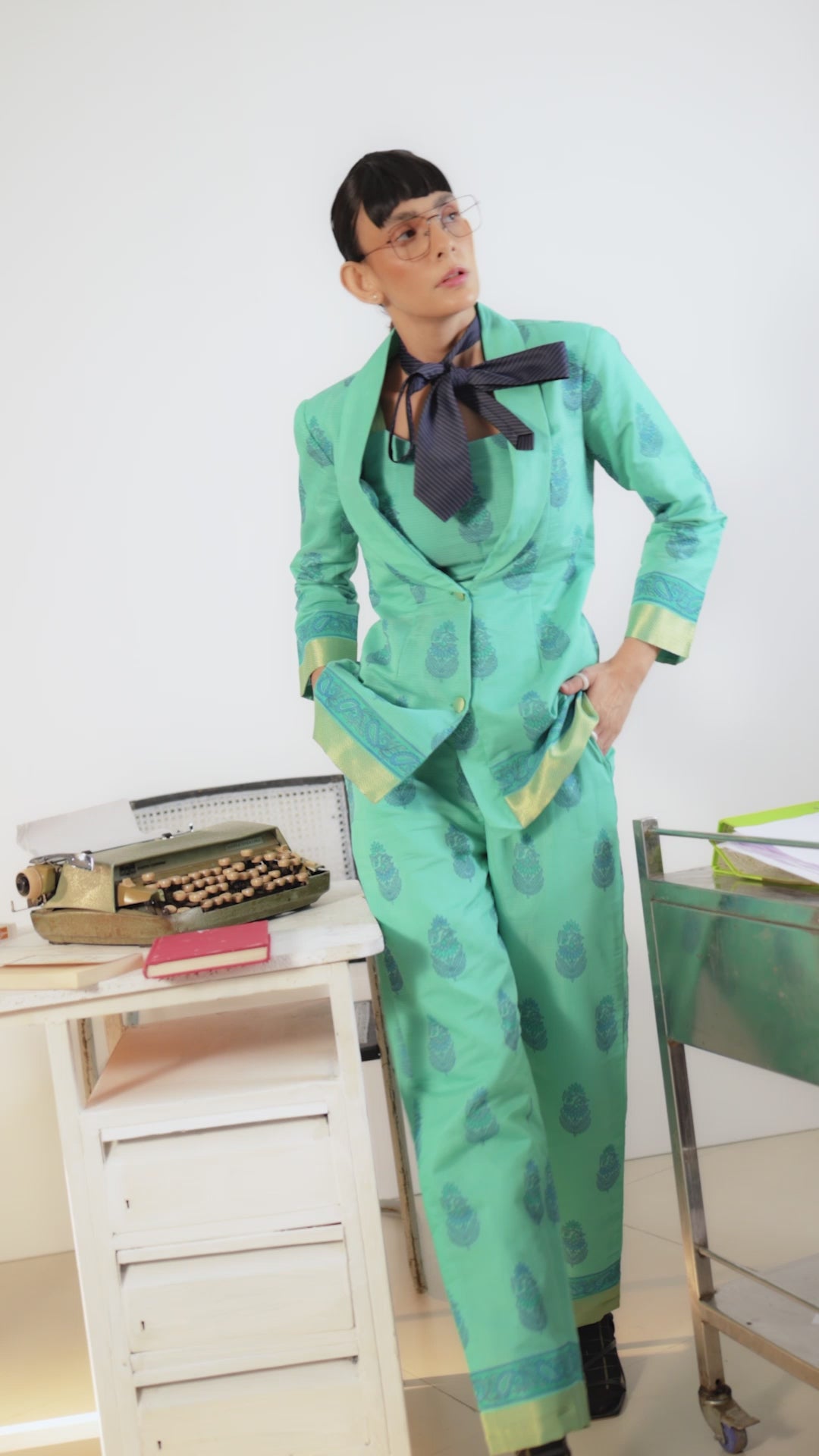 Crop Top: The matching crop top is both stylish and versatile, with a square neckline that enhances the collarbone. Designed to pair perfectly with the jacket and trousers, this top adds a modern edge to the traditional fabric. The top is designed for a close fit, making it ideal for layering under the jacket.