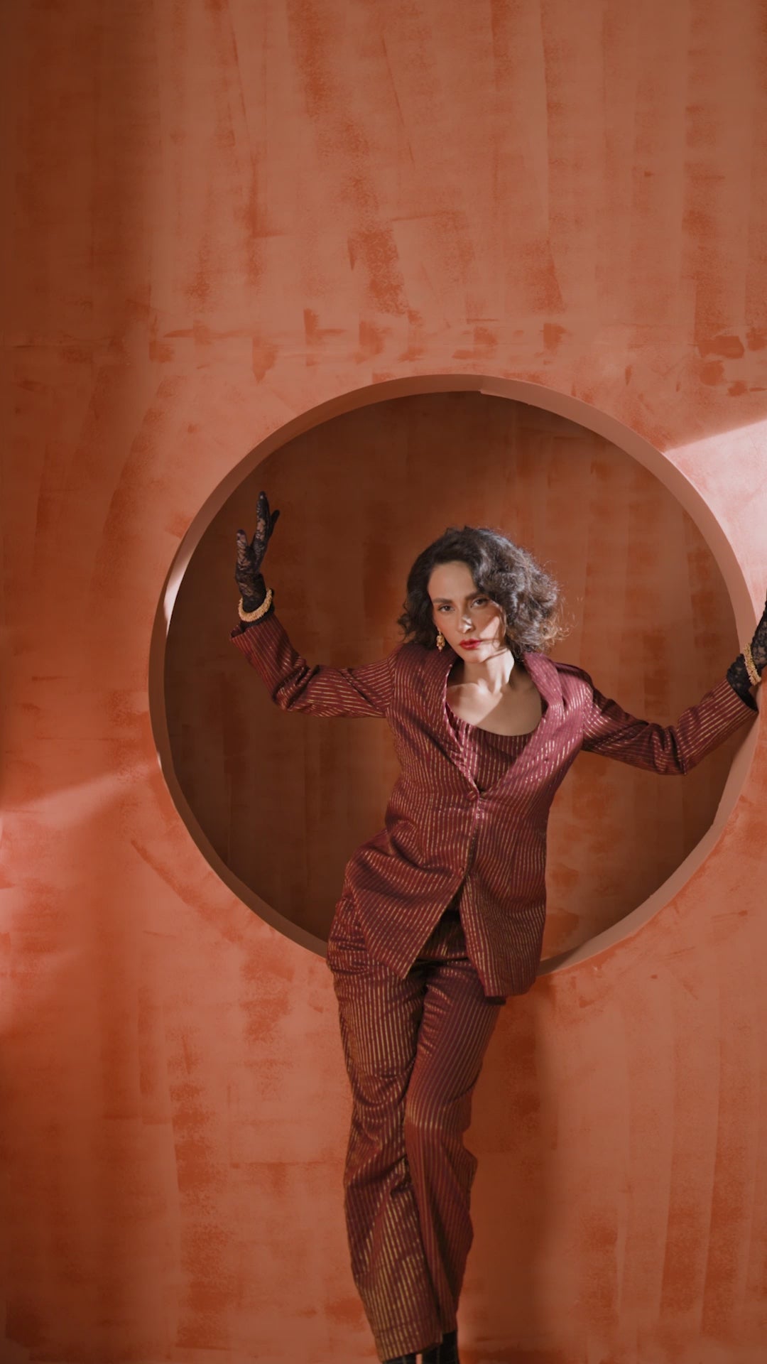 Jacket: The longline jacket is a statement piece, offering a sophisticated fit with sharp shoulder pads and a soft satin lining that ensures a comfortable and structured drape. The subtle stripes in the fabric add a touch of modern elegance, while the deep, rich color exudes timeless charm. The jacket's tailored fit accentuates the waist, creating a flattering silhouette that complements the overall look.